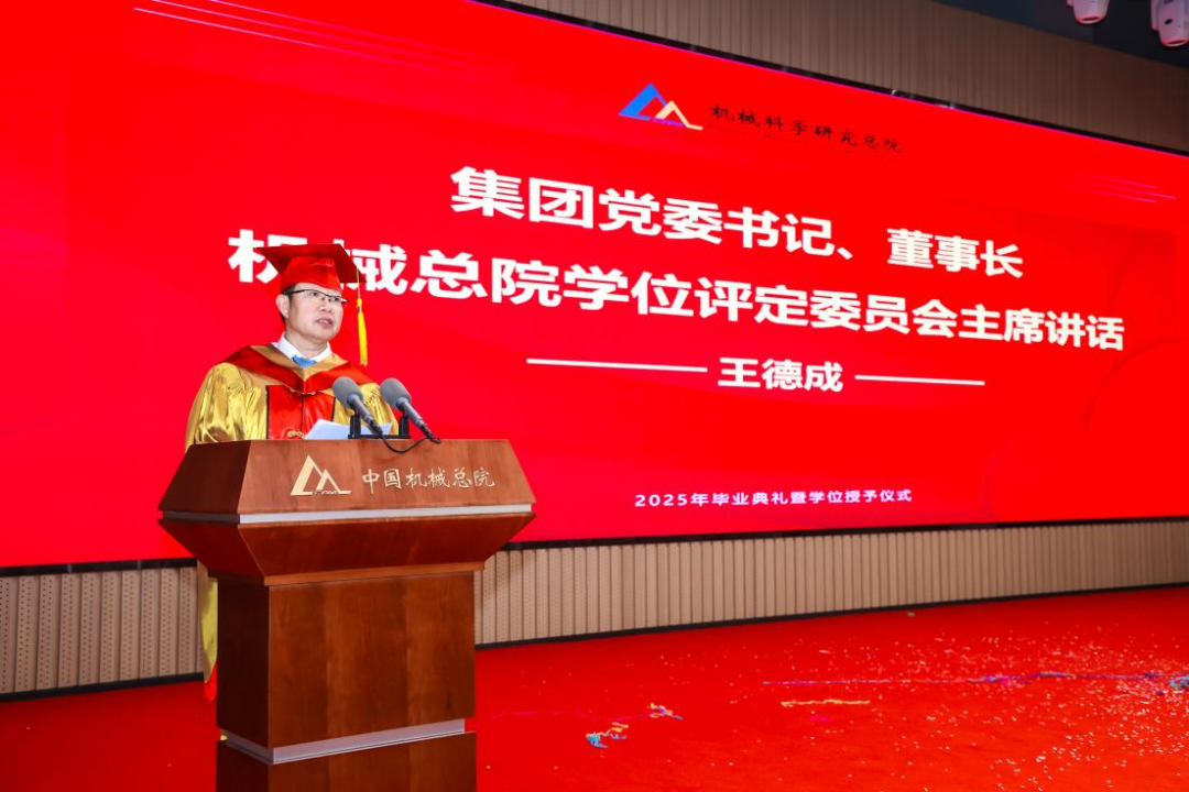 機械總院學位評定委員會主席、集團黨委書記、董事長王德成,集團黨委副書記、總經理孟祥宇,集團黨委副書記、董事李玉鑫,集團黨委委員、副總經理王宇,機械總院學位評定委員會副主席、集團副總經理李愛國,集團副總經理姜超出席典禮,機械總院學位評定委員會委員、京內外各二級單位領導、導師代表、研究生管理部門負責人、2025屆畢業(yè)生及家屬共計190余人齊聚一堂,共同見證這一重要時刻。典禮由機械總院學位評定委員會秘書長、研究生院副院長邊翊主持。