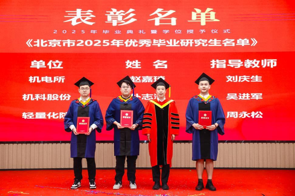 研究生院傾力打造的智慧課程虛擬AI助教“科小研同學”作為典禮第二主持人登上舞臺,現(xiàn)場宣讀了2025年北京市優(yōu)秀畢業(yè)研究生、機械總院優(yōu)秀畢業(yè)研究生、優(yōu)秀學位論文、科技創(chuàng)新成果獎獲得者名單,孟祥宇、李玉鑫、王宇、姜超分別向獲獎同學們頒發(fā)榮譽證書。